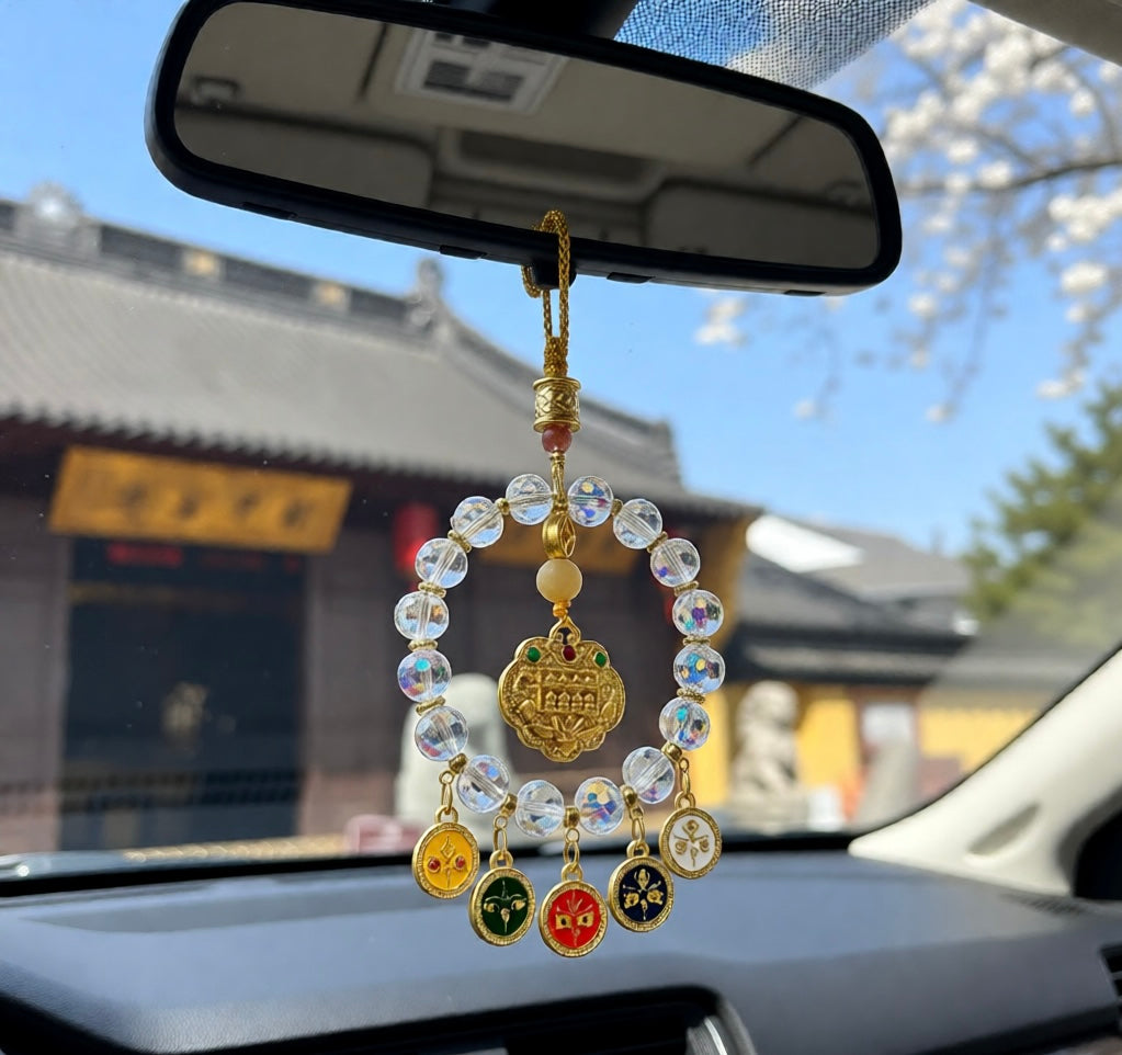 Meet your ultimate travel companion: the Five Roads Wealth Deities Glass Car Charm. Handcrafted from radiant colored glass, it catches the light and turns your car into a beacon of good fortune.