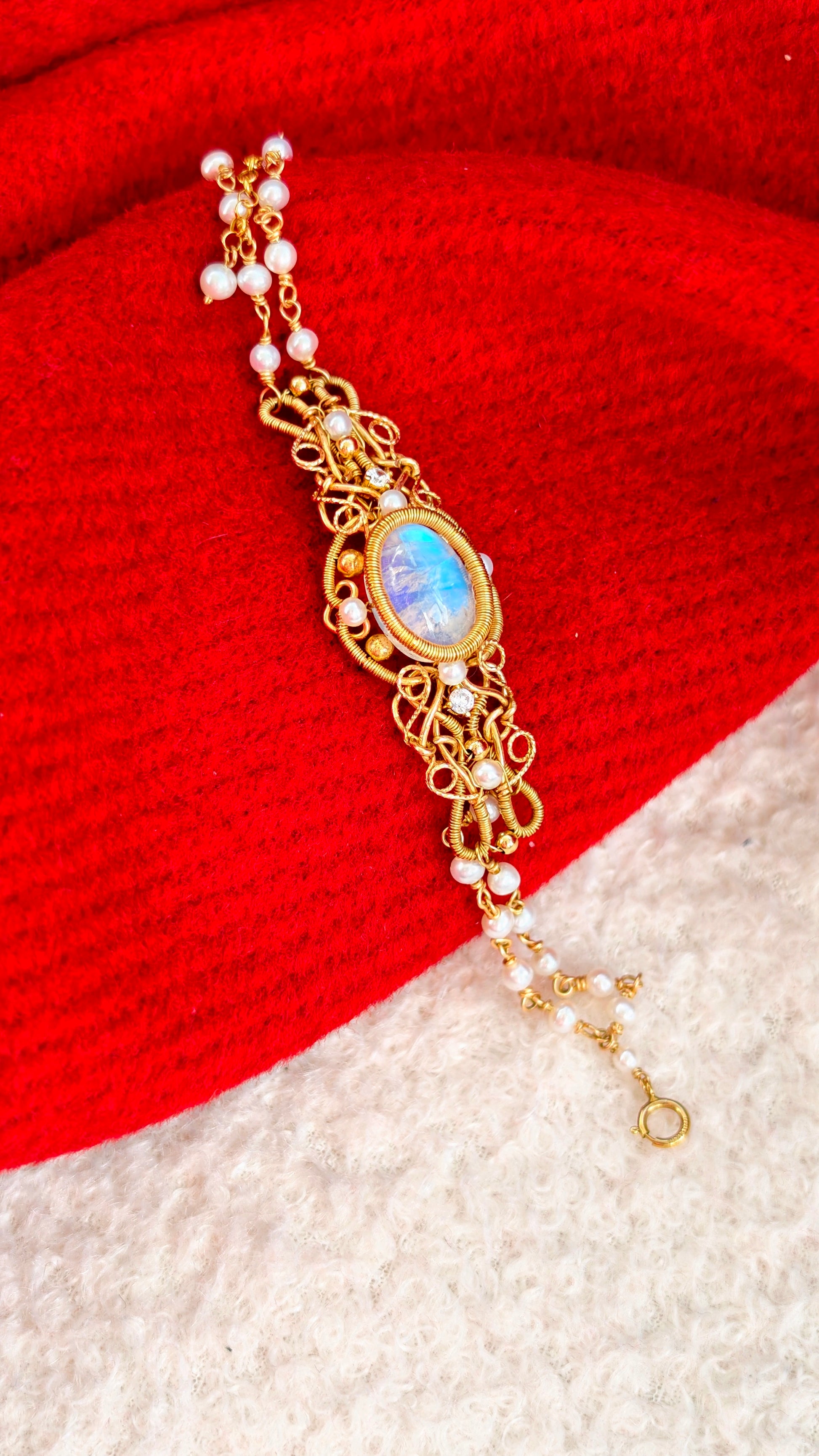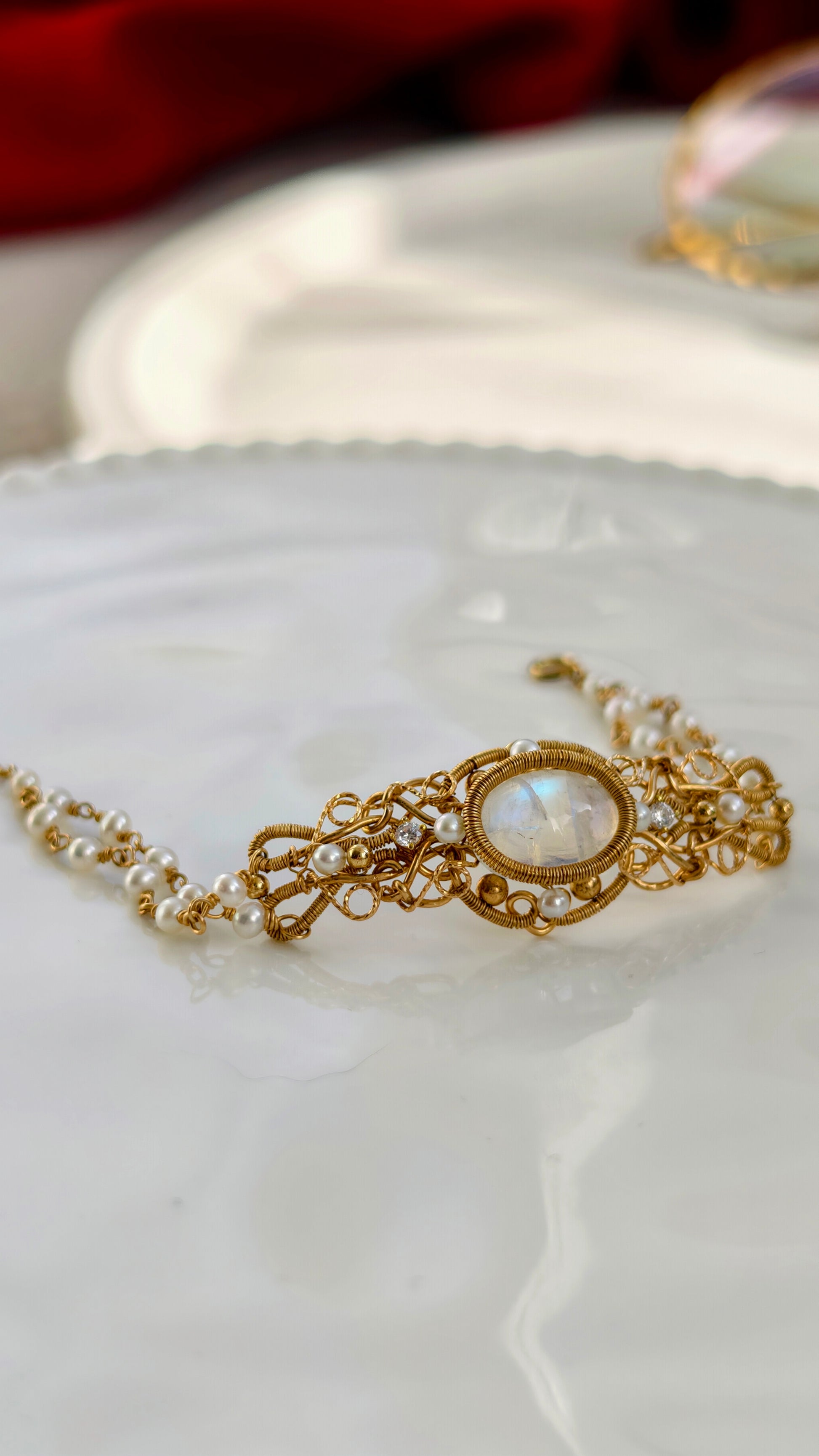 Draped in hand-twisted gold wire and centered with a glowing moonstone cabochon (adorned with its signature adularescent shimmer), this bracelet is more than jewelry—it’s wearable magic. Delicate freshwater pearls and tiny sparkling accents weave through the intricate wirework, blending vintage romance with bohemian grace.